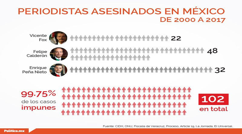 México es considerado uno de los países más peligrosos del mundo para ejercer el periodismo, con más de 200 comunicadores asesinados desde 2000 y tras el cargo de Enrique Peña Nieto, han sido asesinados, según con el acuerdo con la organización Articulo 19, 36 periodistas han sido asesinados en México en el sexenio del presidente Enrique Peña Nieto.