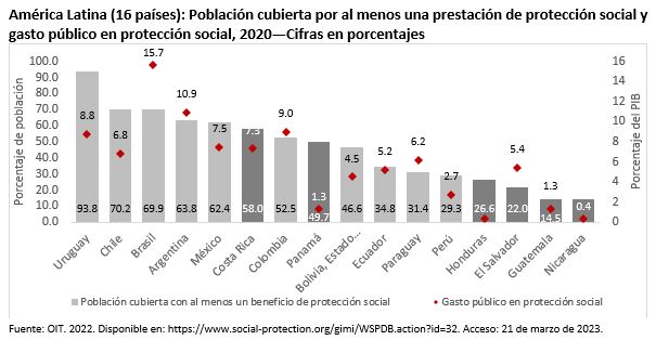 Esto contrasta con el 58.0% de población cubierta por al menos una prestación de protección social en Costa Rica, con el 70.2% de Chile o el 93.8% de Uruguay. Lo anterior también se refleja en que los últimos tres países con menos gasto público en protección social de América Latina sean también centroamericanos, esto en comparación con su Producto Interno Bruto (PIB): Nicaragua (0.4%), Guatemala (1.3%), y Panamá (1.3%).