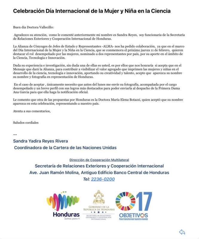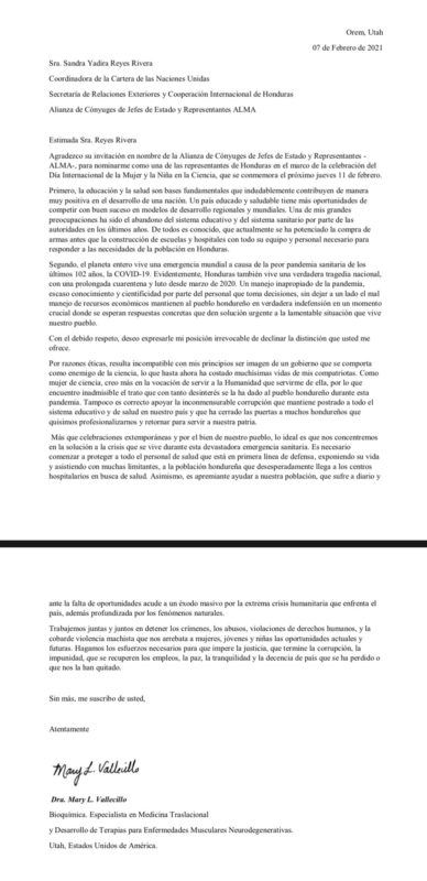 Tegucigalpa.- La científica hondureña, Mary Lorena Vallecillo, radicada en Utah Estados Unidos, declinó representar a la mujer científica hondureña ante la invitación girada por la Secretaría de Relaciones Exteriores de Honduras.