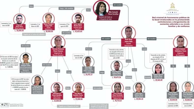 El informe titulado «Red criminal de funcionarios involucrados en contrataciones y otorgamientos de aumentos salariales a su círculo familiar y de confianza en la Sesal», señaló que dicho entramado ha estado operando entre 2020 y 2021, y su conformación en los cargos de dirección de la Sesal tiene como finalidad la intervención en la toma de decisiones importantes sin problemas ni controles, y el intercambio de favores entre los que integran dicha estructura.