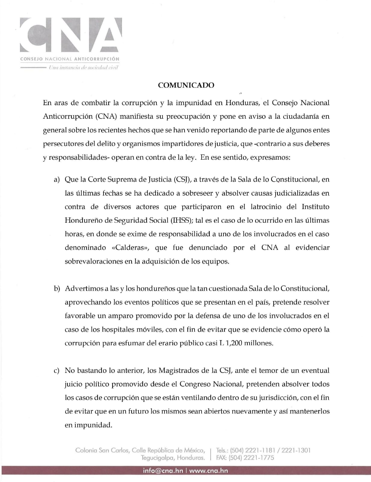 El comunicado también advierte que la Sala de lo Constitucional, aprovechando los eventos políticos que se presentan en el país, pretende resolver favorable un amparo promovido por la defensa de uno de los involucrados en el caso de los hospitales móviles, con el fin de evitar que se evidencie cómo operó la corrupción para esfumar del erario casi 1,200 millones de lempiras.