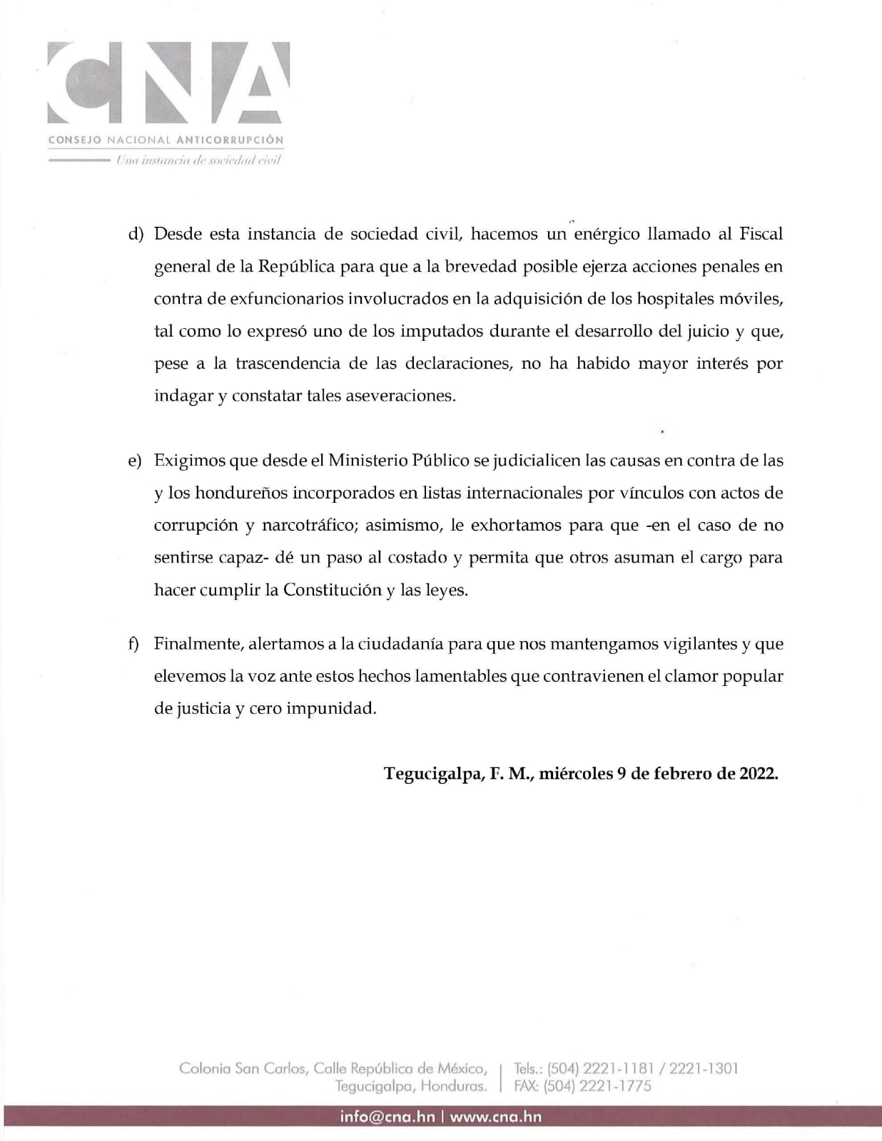 El CNA hace un llamado al Fiscal general de la República, Óscar Chinchilla, para que ejerza acciones penales en contra de exfuncionarios involucrados en la adquisición de los hospitales móviles, tal como lo expresó uno de los imputados durante el desarrollo del juicio y que, pese a la trascendencia de las declaraciones, no ha habido mayor interés por indagar y constatar tales aseveraciones.