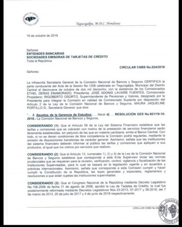 La circular No.024/2018, señala la medida es en respuesta a la Asociación Hondurena de Instituciones Bancarias (AHIBA), que solicitó, el 15 de agosto, revisar el límite monetario de veinte lempiras.
