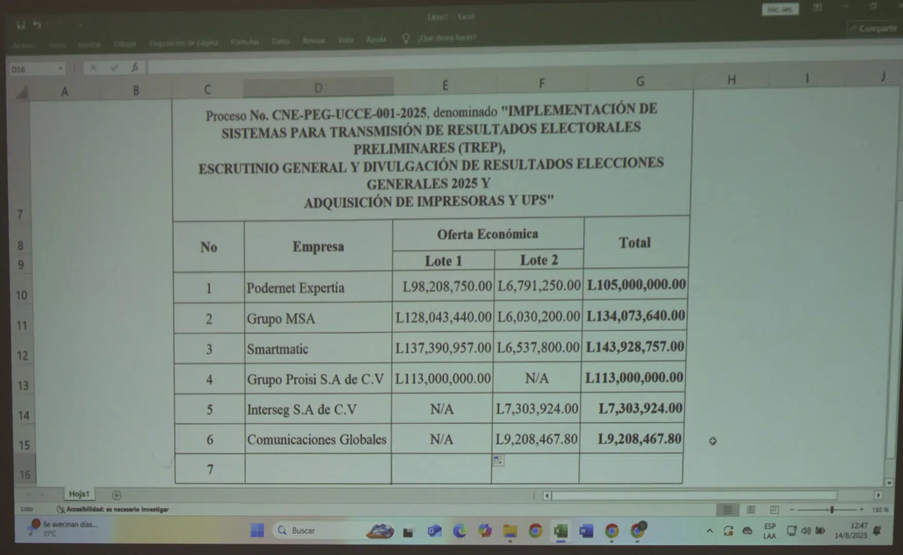Podernet Expertía fue la primera empresa en presentar su oferta económica y se posicionó como la de menor valor, al ofertar L.98,208,750.00 para el lote 1 y L.6.791.250.00 para el lote 2, lo que suma 105 millones de lempiras.