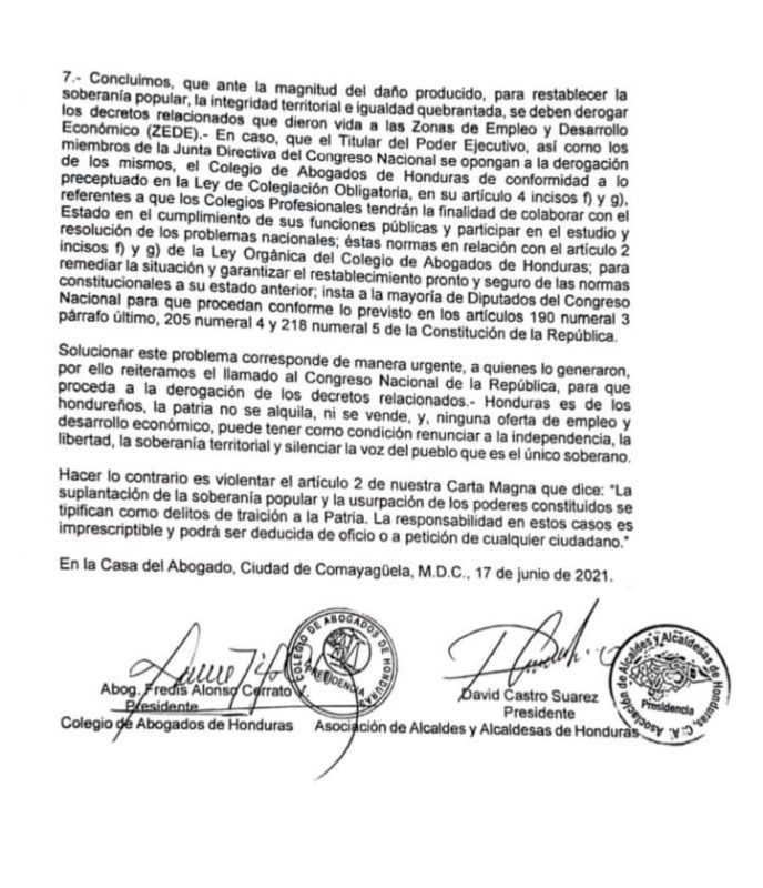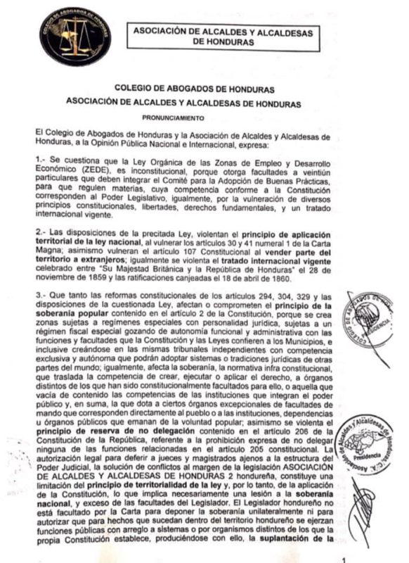 Tegucigalpa.- El Colegio de Abogados de Honduras (CAH) y la Asociación de Alcaldes y Alcaldesas de Honduras exigieron la derogación de los decretos que dieron vida a las Zonas de Empleo y Desarrollo Económico (ZEDE); advirtiendo que la suplantación de la soberanía popular y la usurpación de poderes constituidos son tipificados por la Constitución de la República como delitos de traición a la patria.