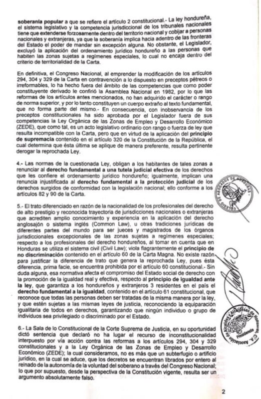El documento comienza delineando que facultar a los miembros del Comité para la Adopción de Buenas Prácticas (CAMP) para que regulen competencias que corresponden al Poder Legislativo es inconstitucional. También subrayan que se están vulnerando el principio de aplicación territorial de la ley nacional y el tratado Wyke-Cruz suscrito entre Honduras y Gran Bretaña, por medio del cual Honduras se compromete a no ceder o vender los territorios que corresponden a los departamentos de Islas de la Bahía y Gracias a Dios.