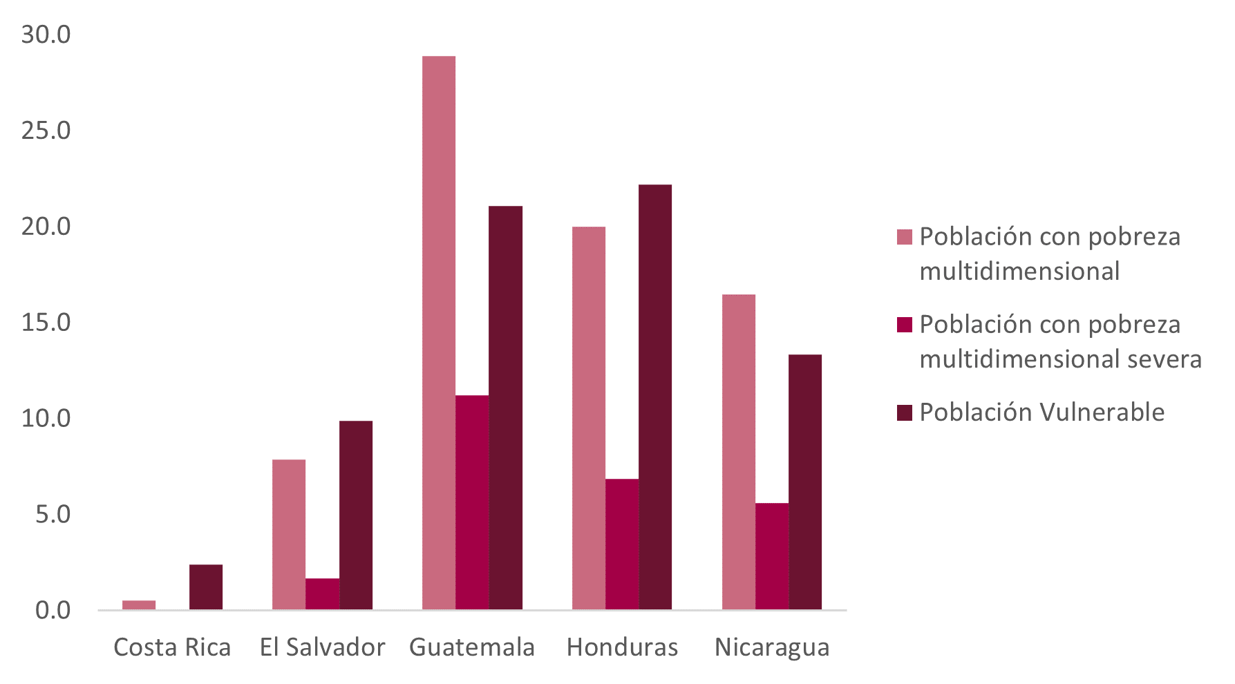 En el caso de Centroamérica, Costa Rica presenta el menor porcentaje de población con pobreza multidimensional (0.54%), mientras Guatemala presenta un 11.2% de la población siendo afectada por dicho fenómeno. Costa Rica y El Salvador muestran un pequeño porcentaje de población con pobreza multidimensional severa (0.02% y 1.66%), mientras Guatemala, Honduras y Nicaragua muestran unos porcentajes del 11.22%, 6.85% y 5.61% respectivamente. Si bien los anteriores porcentajes podrían considerarse muy bajos, hay que poner especial énfasis en aquella población vulnerable en caer en la situación de pobreza multidimensional, lo cual muestra la fragilidad que se tiene en la región. Para el caso de Panamá no se tienen datos disponibles.