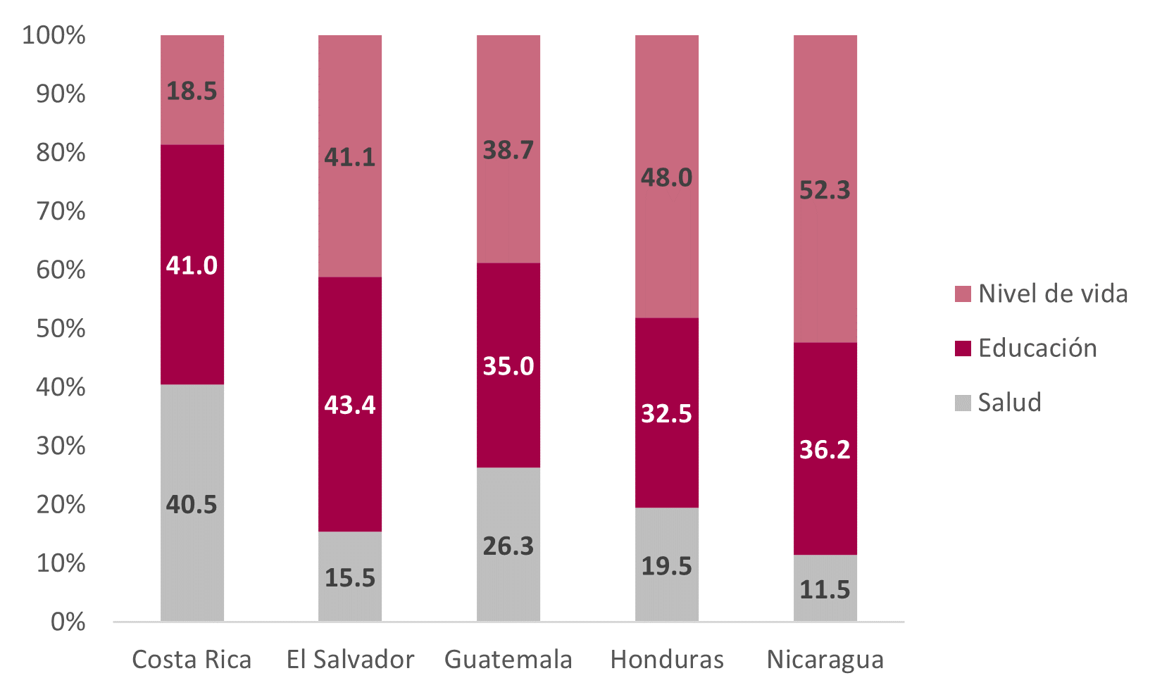 Para el caso de El Salvador, Guatemala, Honduras y Nicaragua, las privaciones se concentran en los aspectos relacionados al nivel de vida y educación. En el caso de Nicaragua, la variable relacionada al nivel de vida compone un 52.3% al índice de pobreza multidimensional, y para El Salvador son las variables relacionadas a la educación. Mientras tanto, Guatemala, muestra un comportamiento casi uniforme en la composición de las tres dimensiones.