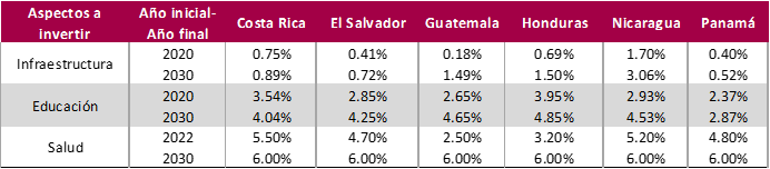 En este caso, para atacar las causas de la pobreza multidimensional, los esfuerzos podrían dirigirse a sectores tales como educación (cuyo meta sería acercarse a una cobertura universal); salud (cuya meta sería disminuir las barreras de acceso a la atención primaria en un 30%); así como infraestructura para atajar lo relacionado a la dimensión de nivel de vida (ya que en esta se toman en cuenta elementos como saneamiento, acceso a agua potable y electricidad). En la tabla No. 01 se muestran los niveles de gasto público como porcentaje del PIB estimados para 2030 que los países de la región deberían alcanzar para lograr atajar las ya mencionadas brechas de cobertura. El panorama se torna desafiante en el futuro, pero al menos iniciando la inversión necesaria, se podrá ir poniendo los cimientos para tener sociedades más inclusivas y equitativas en Centroamérica.