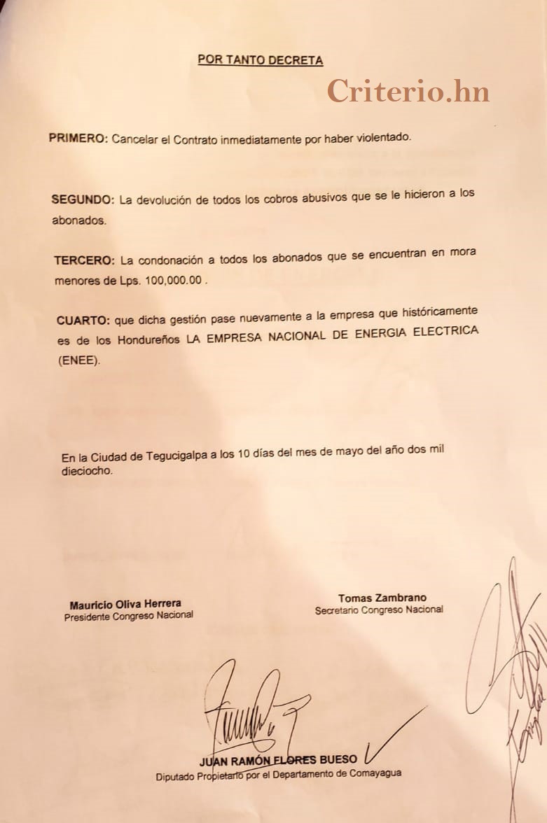 La propuesta para la revisión y cancelación del contrato de la EEH con el Estado de Honduras fue presentada por el diputado por Comayagua Juan Ramón Flores unos días atrás.