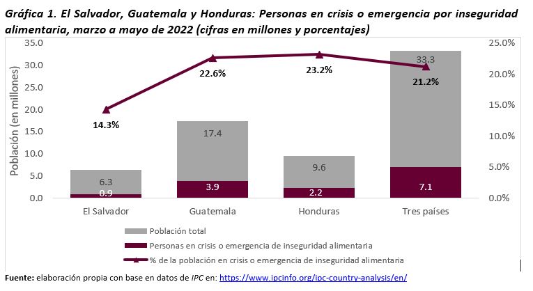 Cifras presentadas por el Integrated Food Security Phase Classification (IPC) muestran que, entre marzo y mayo de 2022, alrededor de 7.2 millones de los 33.3 millones de personas que habitan los países del norte de Centroamérica (El Salvador, Guatemala y Honduras) enfrentaron crisis o emergencia por inseguridad alimentaria (un 21.6% de la población total).