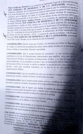 Se mostraron evidencias de las maniobras ejecutadas desde la Secretaría de trabajo para evitar la sindicalización de cientos de mujeres que trabajaban en condiciones deplorables, hubo una conferencia de prensa en la capital de Honduras y unas semanas después, ejecutivos de las transnacionales y la secretaría de trabajo acordaron reconocer los derechos laborales de las trabajadoras y proceder a su recontratación. Pero antes de esta decisión hay una serie de resoluciones adversas como la siguiente: