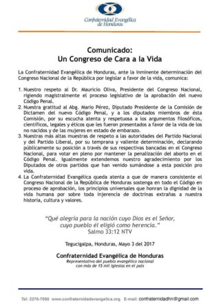 Tegucigalpa.- La Confraternidad Evangélica de Honduras, felicitaron a los diputados del Partido Nacional y del Partido Liberal en el Congreso Nacional por no penalizar el aborto.