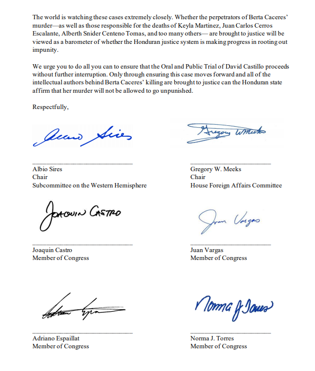 El mundo está observando estos casos muy de cerca. Si los perpetradores del asesinato de Berta Cáceres —así como los responsables de los asesinatos de Keyla Martínez, Juan Carlos Cerros Escalante, Alberth Snider Centeno Tomás y demasiados otros— son llevados ante la justicia, será visto como un barómetro de lo que el sistema de justicia hondureño está avanzando en la erradicación de la impunidad.Lo instamos a hacer todo lo posible para garantizar que el juicio oral y público de David Castillo se desarrolle sin más interrupciones. Solo asegurando que este caso avance y que todos los autores intelectuales detrás del asesinato de Berta Cáceres sean llevados ante la justicia, la ley hondureña podrá afirmar que no se permitirá que el asesinato de hacer quede impune.