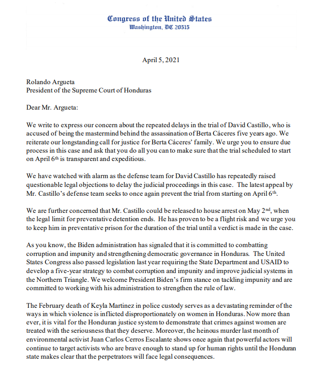 Escribimos para expresar nuestra preocupación por los reiterados retrasos en el juicio de David Castillo, acusado de ser el autor intelectual del asesinato de Berta Cáceres hace cinco años. Reiteramos nuestro antiguo llamado a que se haga justicia para la familia de Berta Cáceres. Lo instamos a garantizar el debido proceso en este caso y le pedimos que haga todo lo posible para asegurarse de que el juicio programado para comenzar el 60 de abril sea transparente y rápido.