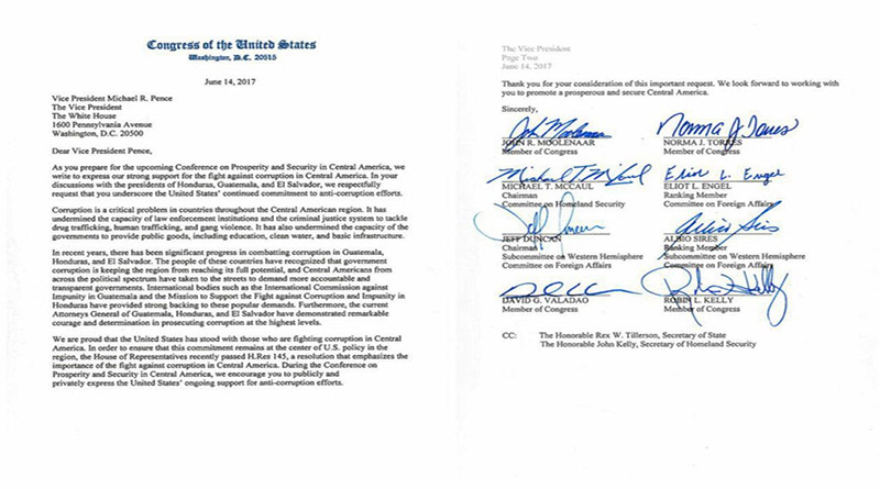“La corrupción es un problema crítico en Centroamérica… que ha debilitado la capacidad de las instituciones policiales y a los sistemas de justicia criminal para combatir el narcotráfico, el tráfico de personas y la violencia de las pandillas”, dice la carta fechada el 14 de junio de 2017, dirigida al vicepresidente Michael Pence y copiada al secretario de Estado Rex Tillerson y al secretario de Seguridad Interna John Kelly.
