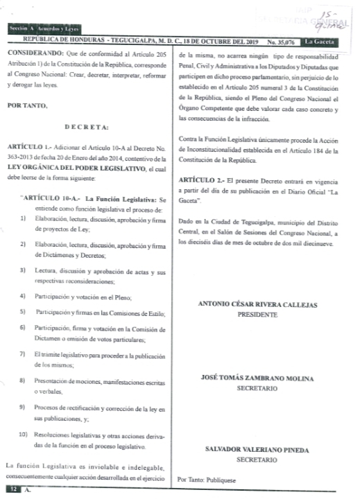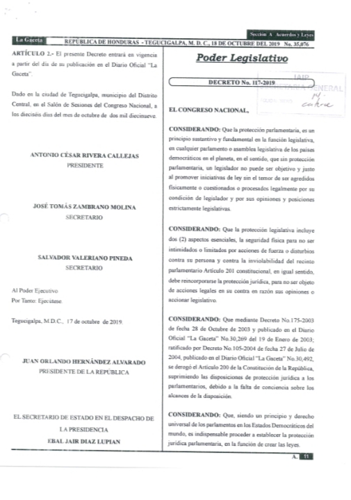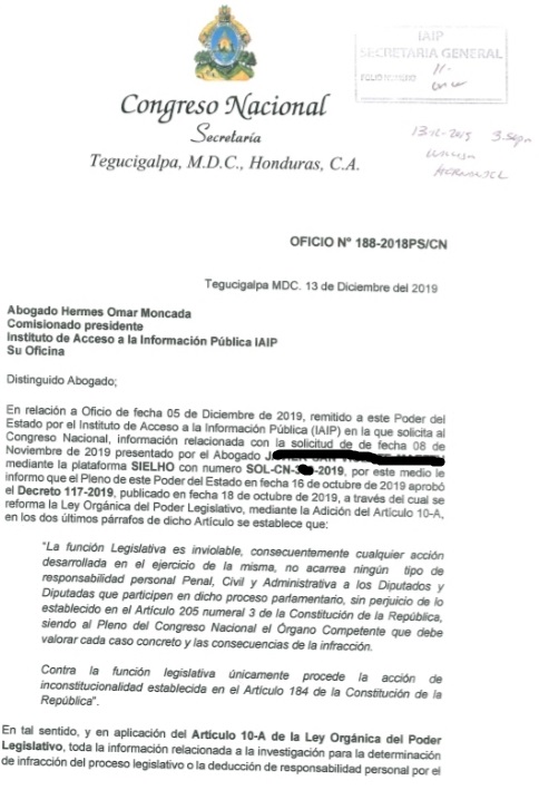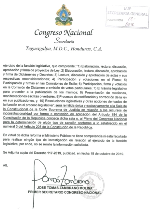 El secretario del Congreso Nacional, José Tomás Zambrano le envió una carta donde le manifiesta que «en virtud de esa reforma hecha en el decreto 117-2019, el Ministerio Público no tiene competencia ni está facultado para realizar ningún tipo de investigación en relación al ejercicio de la función legislativa, por ende, no se remite la información solicitada.