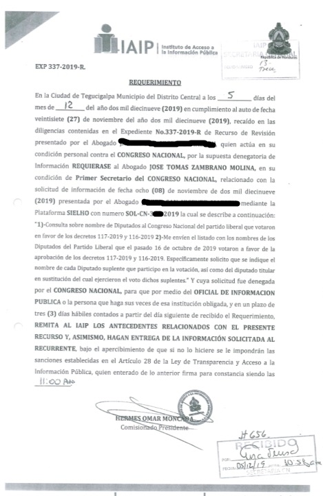 Esta fue la nota enviada por el IAIP requiriendo al secretario del Congreso Nacional Tomás Zambrano por denegar la información solicitada.
