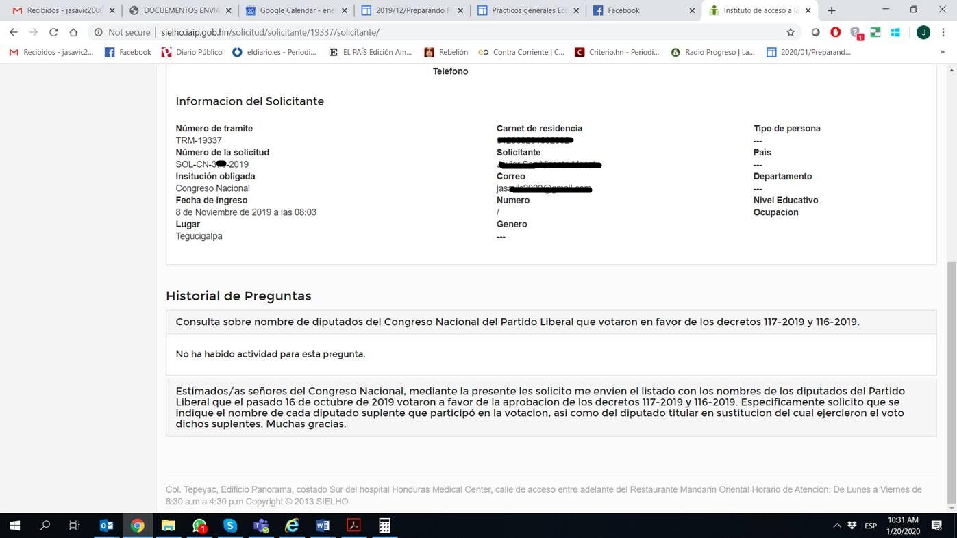 Un ciudadano, profesional del derecho solicitó a través de la plataforma del Sistema de Información Electrónico de Honduras (SIEHLO) del Instituto de Acceso a la Información Pública (IAIP), el listado con los nombres de los diputados del Partido Liberal que el 16 de octubre de 2019 votaron a favor de la aprobación de los decretos 117-2019 y 116-2019.