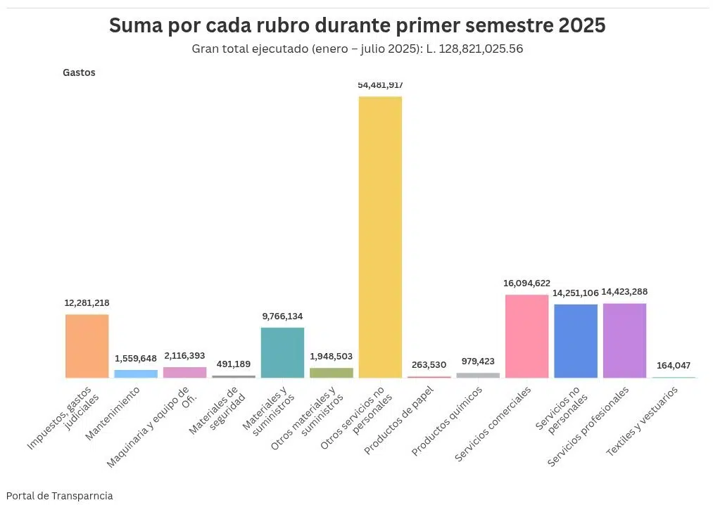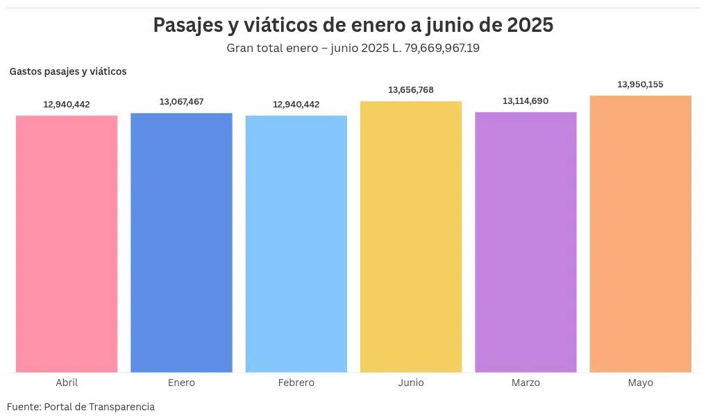El total erogado, corresponde a lo ejecutado entre enero y junio de 2025, porque hasta el momento la Unidad de Transparencia no ha publicado los gastos generados en agosto y septiembre. No obstante, del reporte de los primeros seis meses del año, ronda los 195,868,194.69 lempiras, el cual corresponde el pago de sueldos y viáticos destinado para los 256 diputados (propietarios y suplentes).