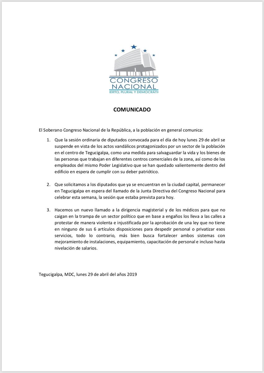 Tegucigalpa.- La junta directiva del Congreso Nacional suspendió la sesión que había convocado este día en horas de la tarde para ratificar la ley de Reestructuración y Fortalecimiento del Sistema de Salud y Educación mas conocida com la «Ley de Masacre laboral», pero no retroceden en la aprobación de la polémica ley.