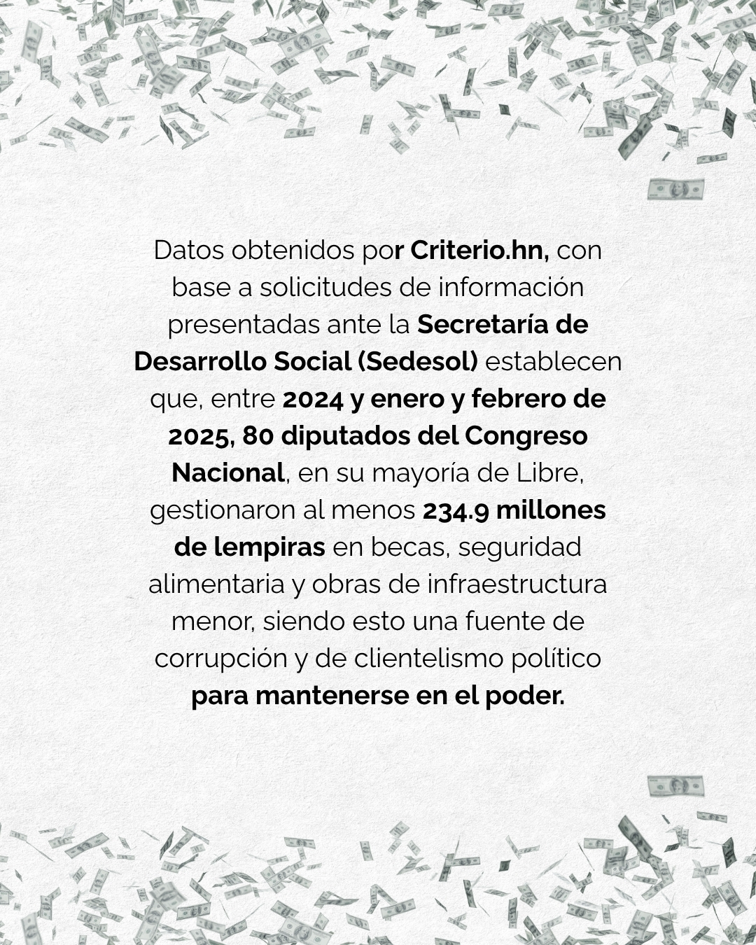 Solicitudes de información a la Secretaría de Desarrollo Social (Sedesol) revelan que 80 diputados del Congreso Nacional, en su mayoría de Libre, gestionaron en 14 meses al menos 234.9 millones de lempiras en becas, seguridad alimentaria y obras de infraestructura menor, siendo esto una fuente de corrupción y de clientelismo político para mantenerse en el poder.