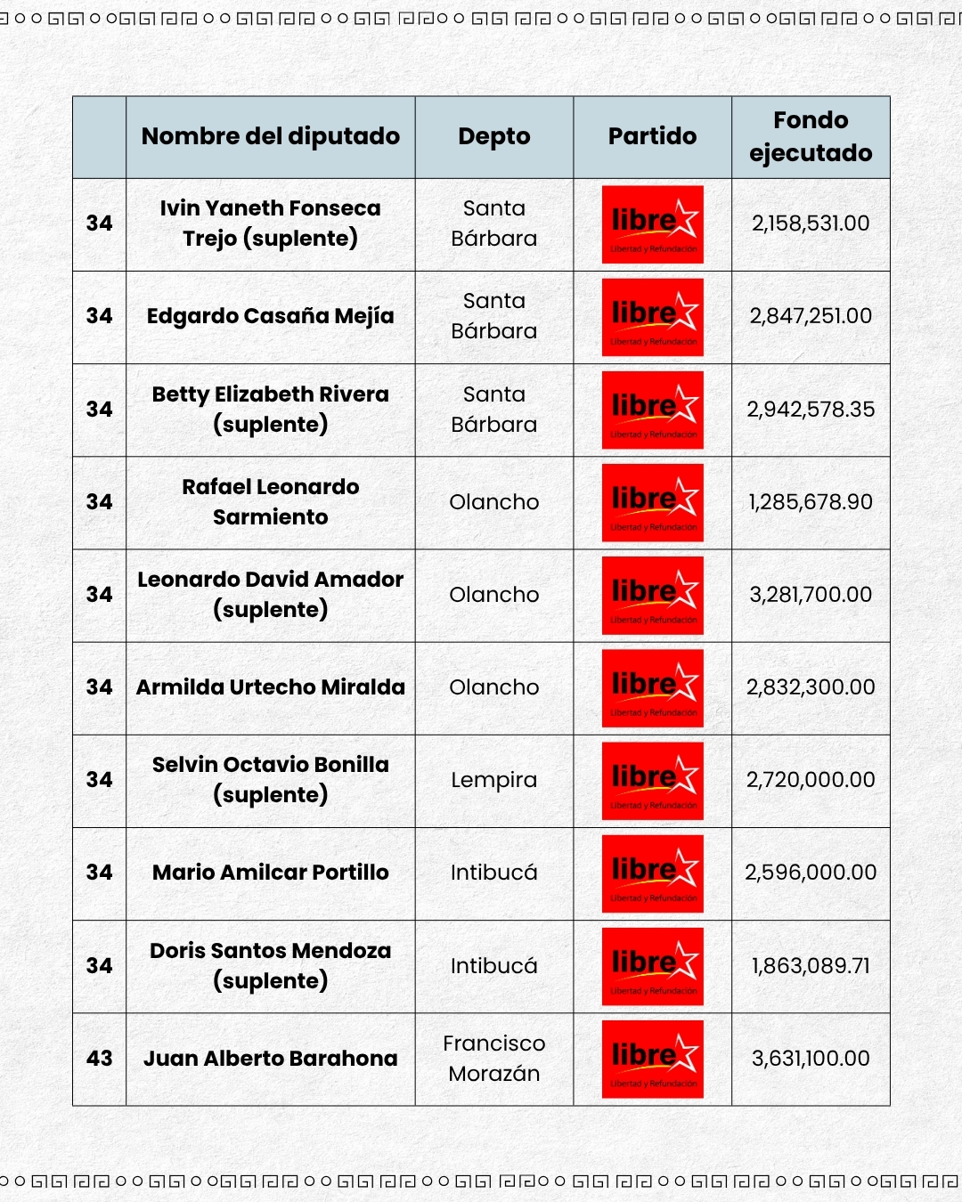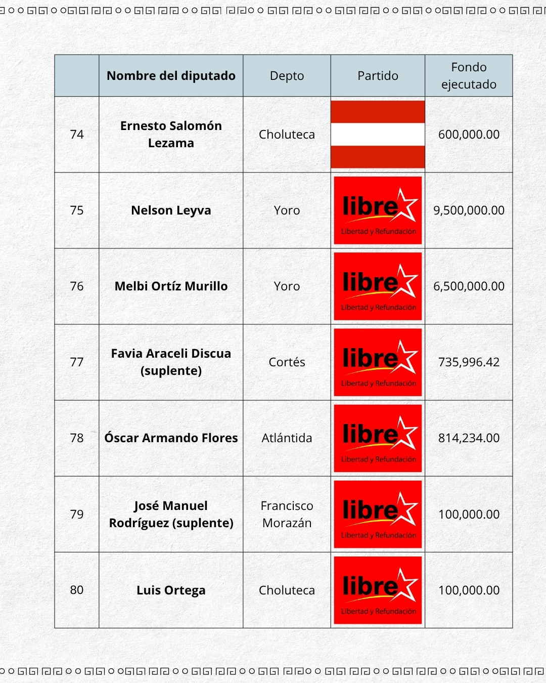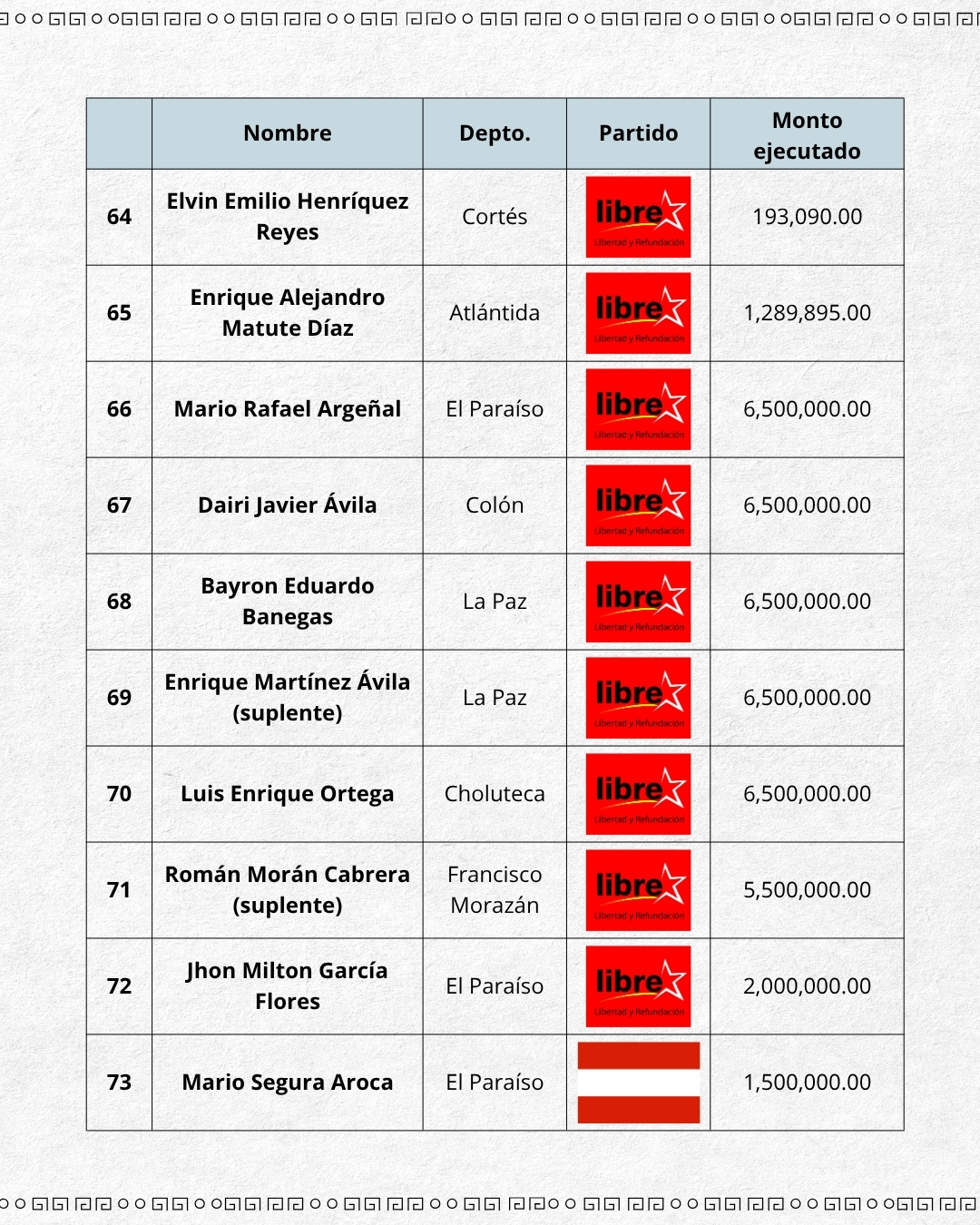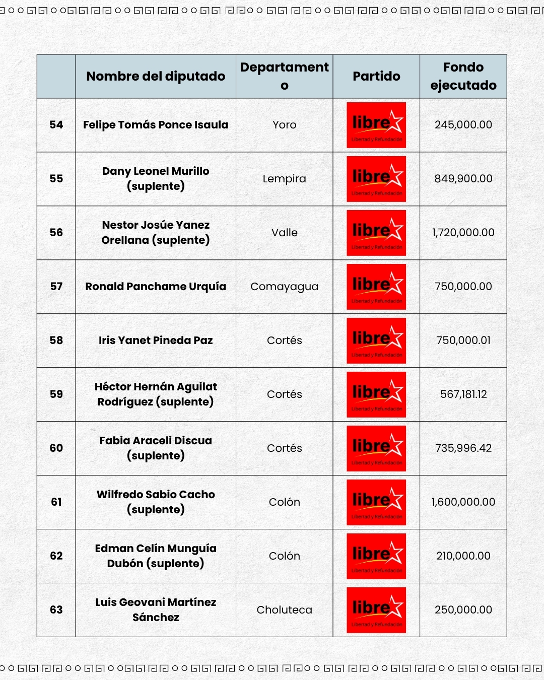 En su respuesta, Sedesol se limitó a dar información de la ejecución de 2024 y de los dos primeros meses de 2025, colocando el nombre de 80 diputados, entre propietarios y suplentes, en su mayoría del oficialista partido Libre. Sin embargo, aparecen también los diputados Carlos Raudales, de la Democracia Cristiana y los liberales, Mario Segura y José Rosario Tejeda [presidente alterno del Congreso] y la diputada suplente Lourdes Maribel Mejía del Partido Salvador de Honduras (PSH) [presidenta alterna del Congreso].
