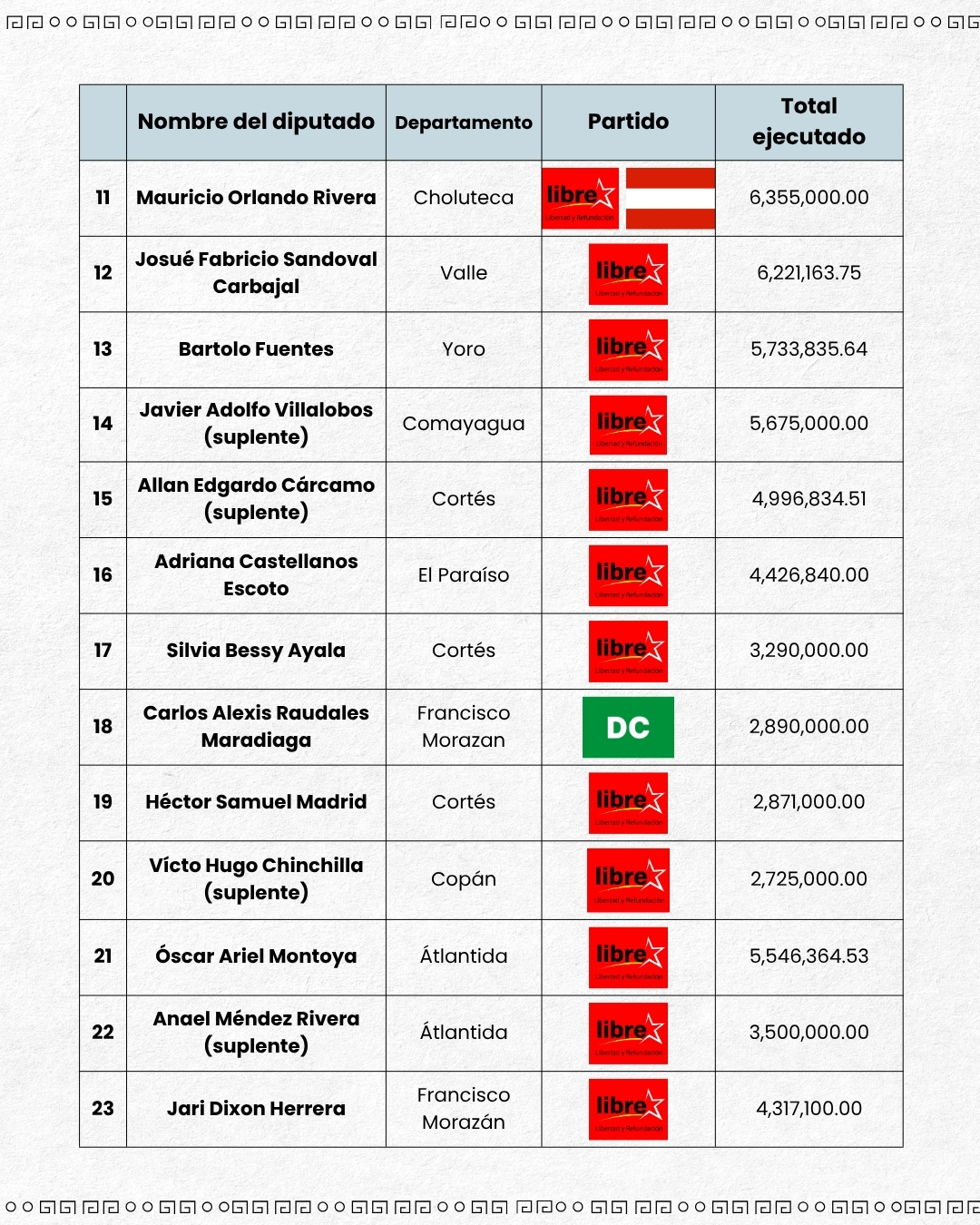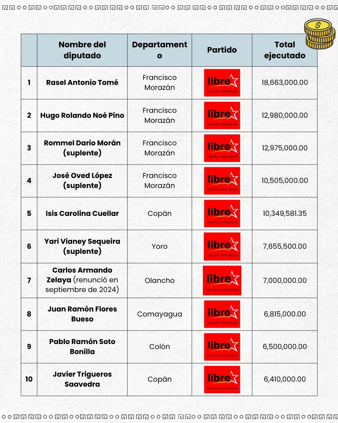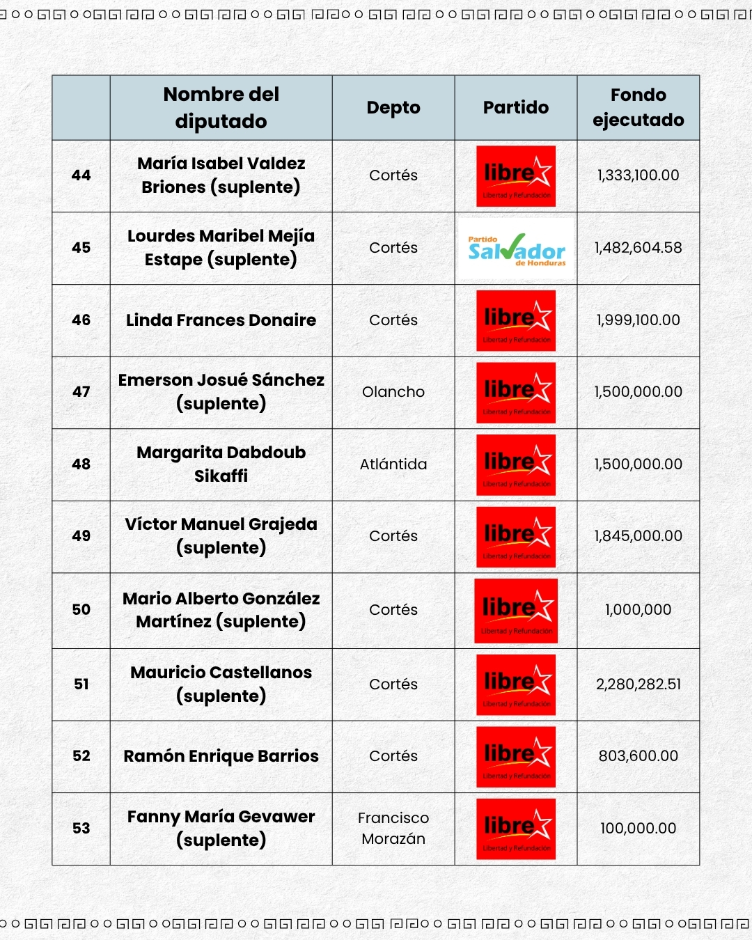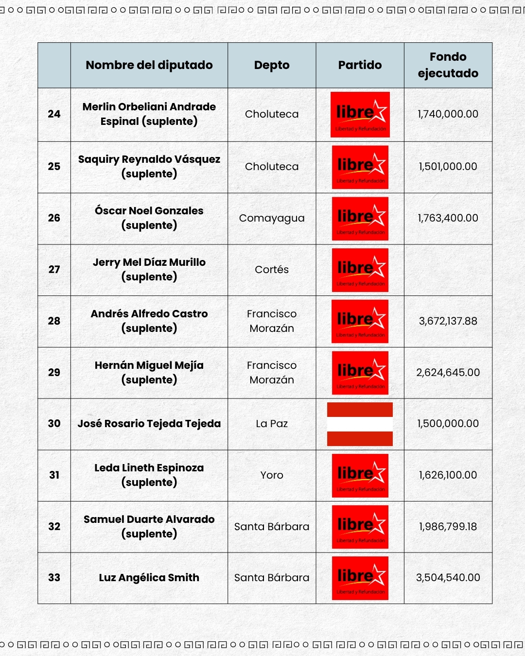 En su respuesta, Sedesol se limitó a dar información de la ejecución de 2024 y de los dos primeros meses de 2025, colocando el nombre de 80 diputados, entre propietarios y suplentes, en su mayoría del oficialista partido Libre. Sin embargo, aparecen también los diputados Carlos Raudales, de la Democracia Cristiana y los liberales, Mario Segura y José Rosario Tejeda [presidente alterno del Congreso] y la diputada suplente Lourdes Maribel Mejía del Partido Salvador de Honduras (PSH) [presidenta alterna del Congreso].