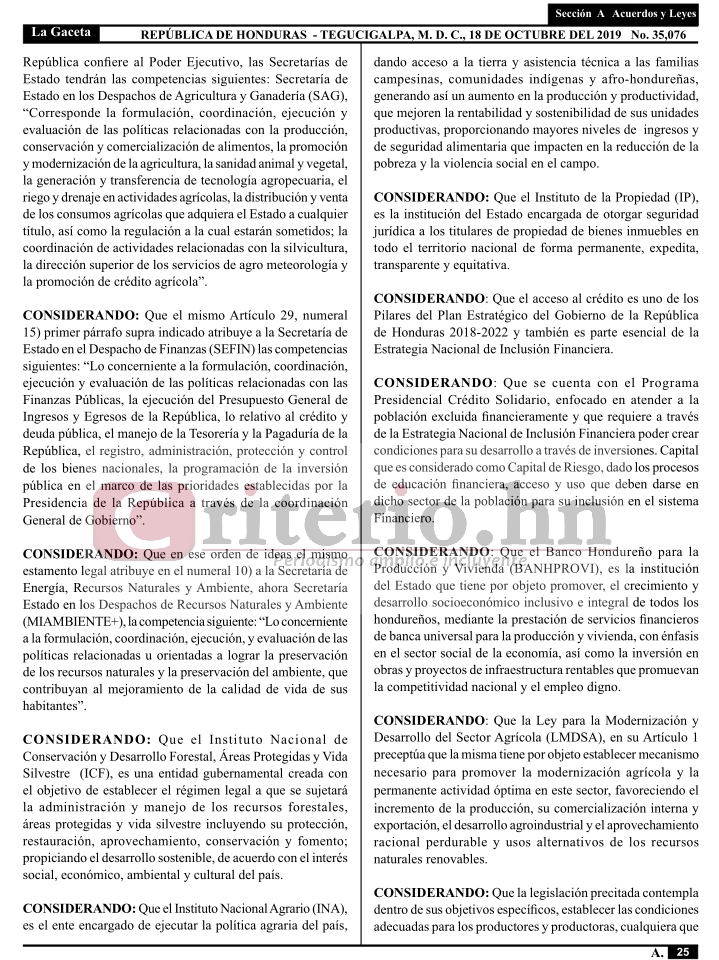 El decreto contiene 17 considerandos y 8 artículos y fue publicado en La Gaceta número 35,076 con fecha 18 de octubre de 2019.