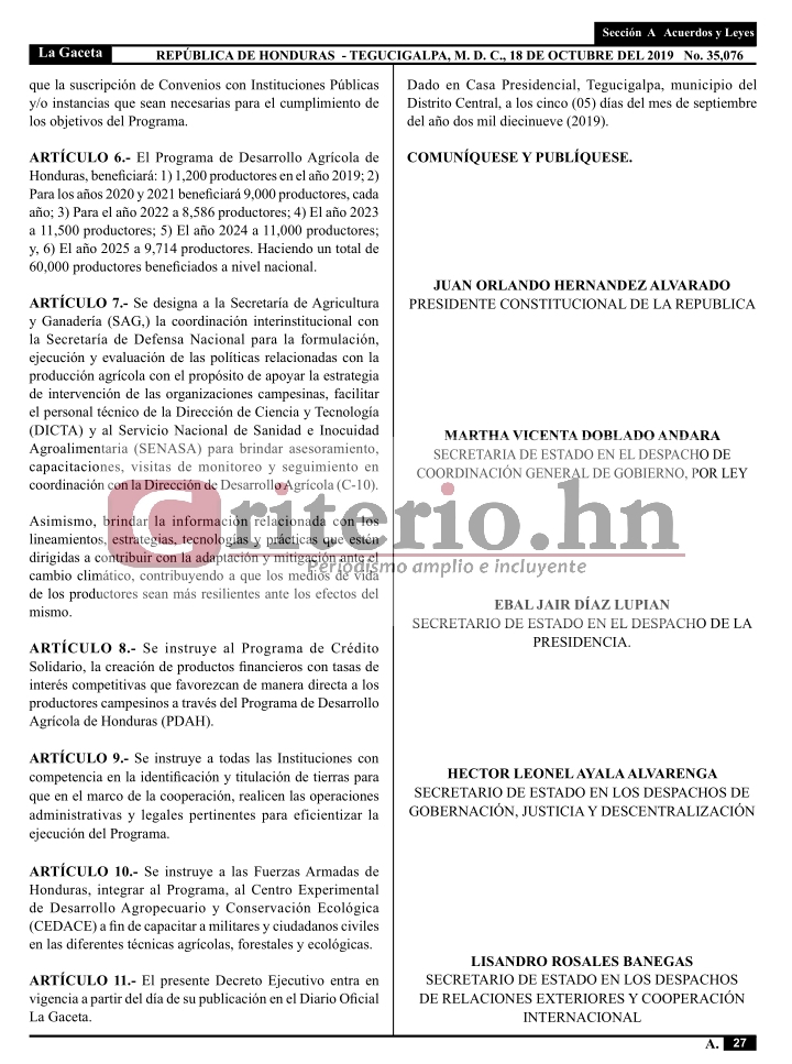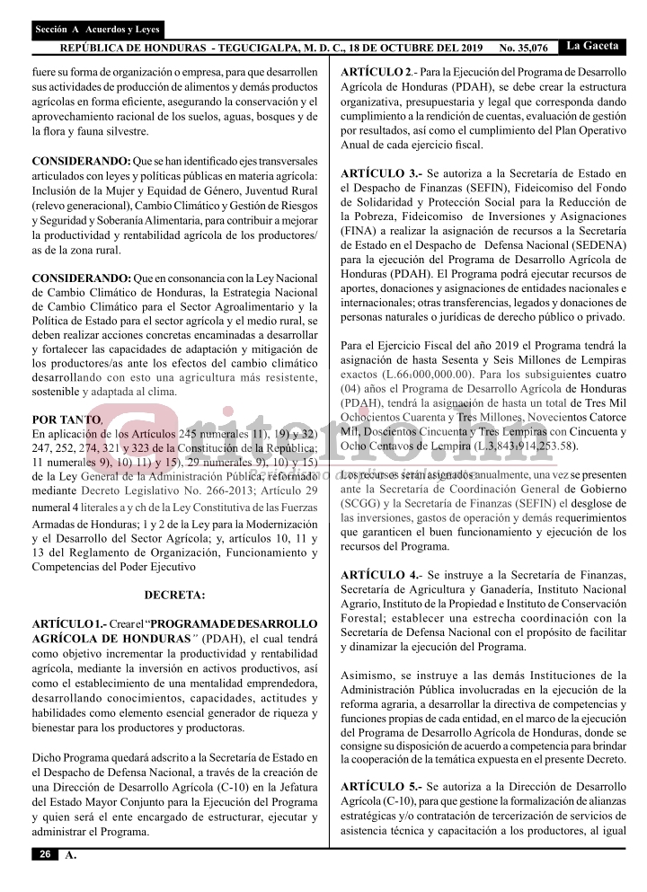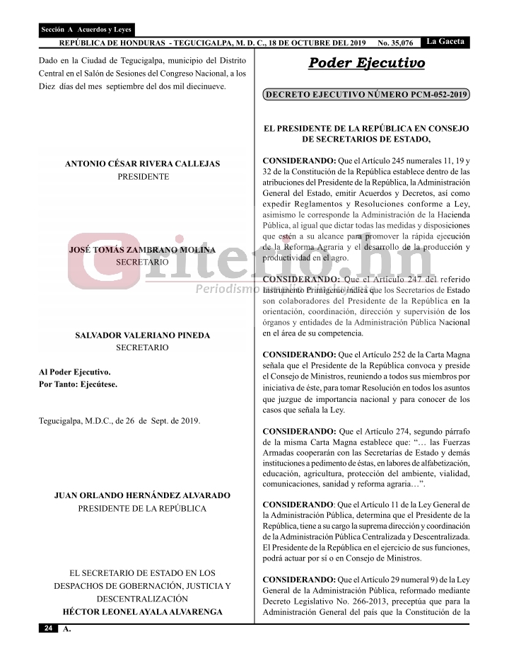 Tegucigalpa. El titular del régimen de Honduras, Juan Hernández en Consejo de Ministros aprobó el 05 de septiembre de 2019 el decreto ejecutivo PCM-052-2019 que contempla el «Programa de Desarrollo Agrícola de Honduras» (PDAH), el cual tendrá como objetivo incrementar la productividad y rentabilidad agrícola y será administrado por la Secretaría de Defensa.