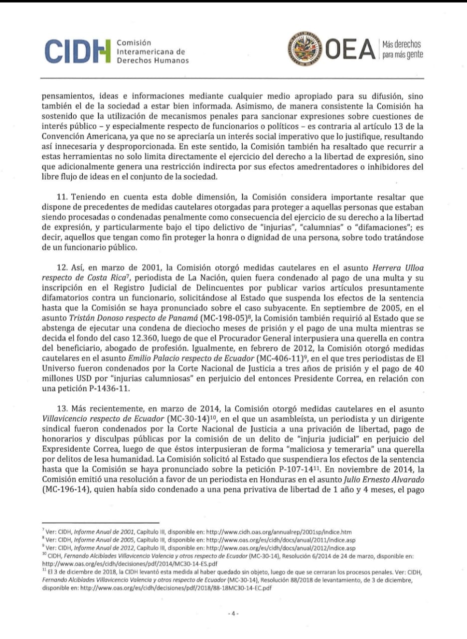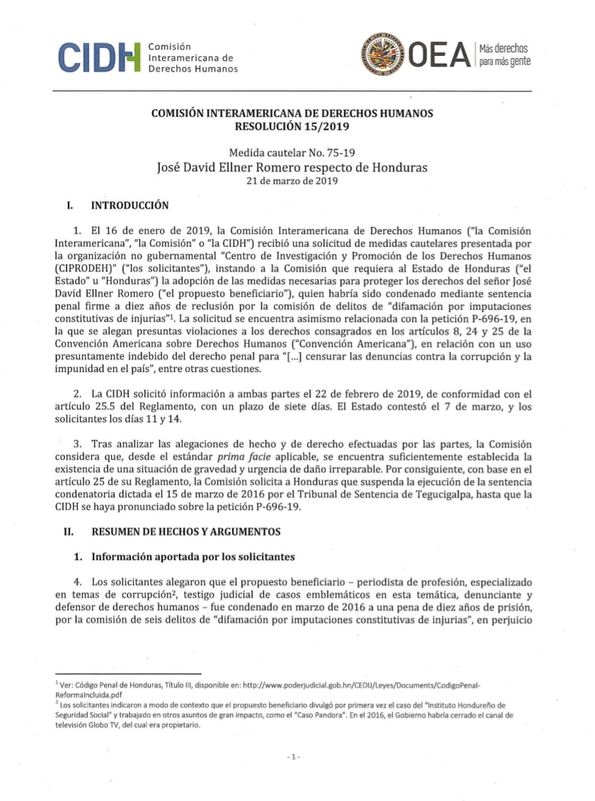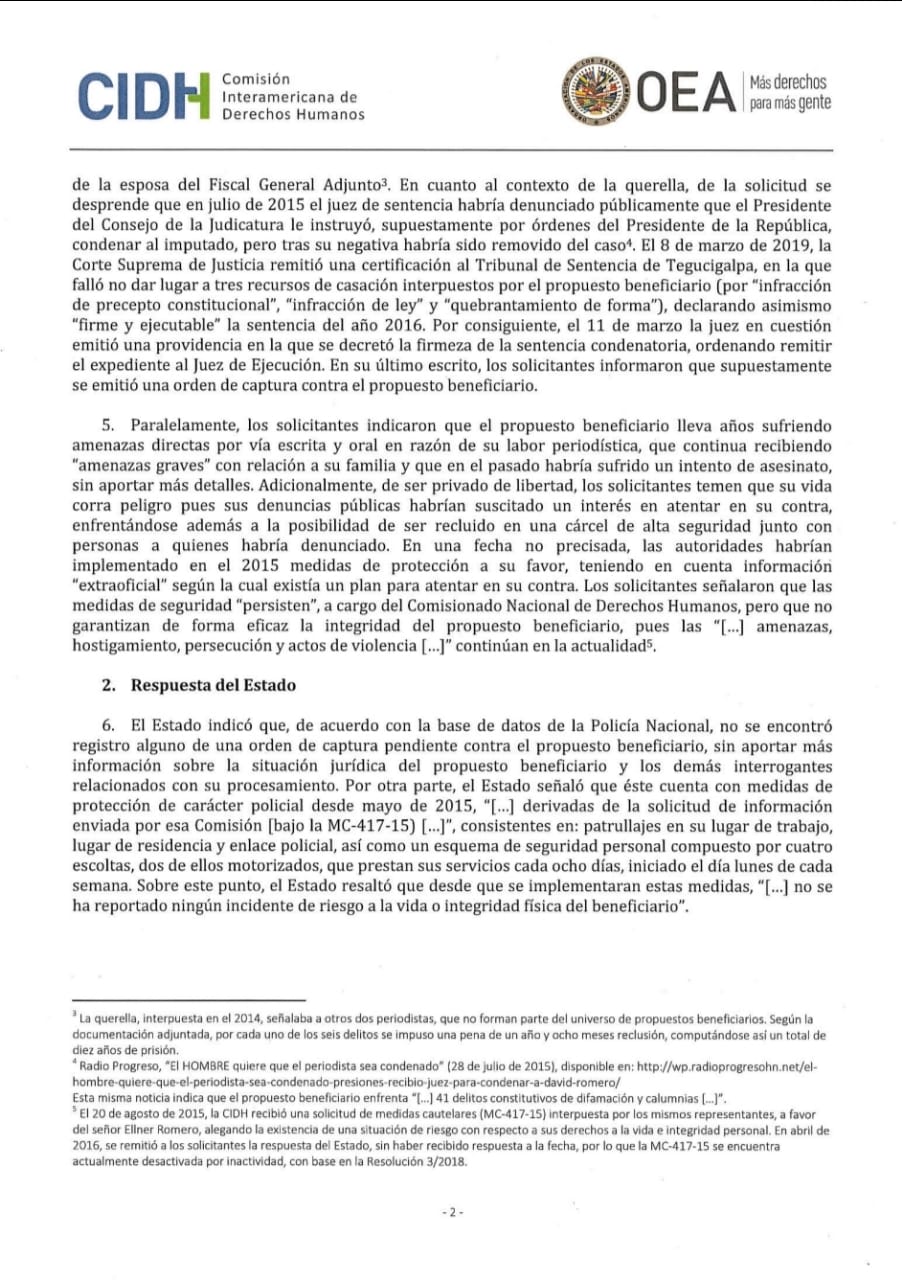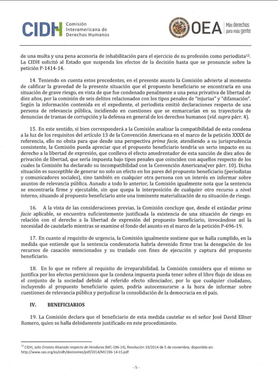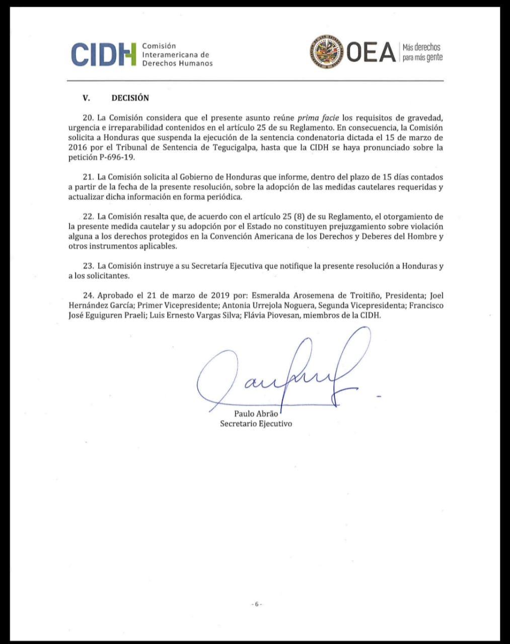 La resolución en su punto numero 20 dice que, «La Comisión considera que el presente asunto reúne prima facie los requisitos de gravedad, urgencia e irreparabilidad contenidos en el artículo 25 de su Reglamento. En consecuencia, la Comisión solicita a Honduras que suspenda la ejecución de la sentencia condenatoria dictada el 15 de marzo de 2016 por el Tribunal de Sentencia de Tegucigalpa, hasta que la CIDH se haya pronunciado sobre la petición P-696-19.