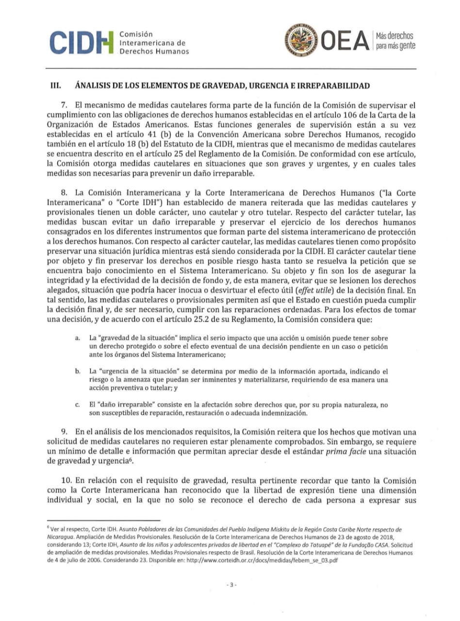 En el numeral 22 de la resolución resalta que, de acuerdo con el artículo 25 (8) de su Reglamento, el otorgamiento de la presente medida cautelar y su adopción por el Estado no constituyen prejuzgamiento sobre violación alguna a los derechos protegidos en la Convención Americana de los Derechos y Deberes del Hombre y otros instrumentos aplicables.