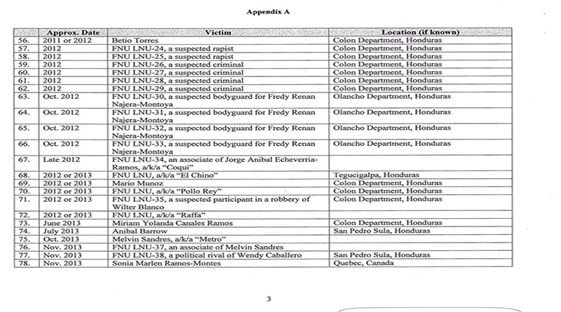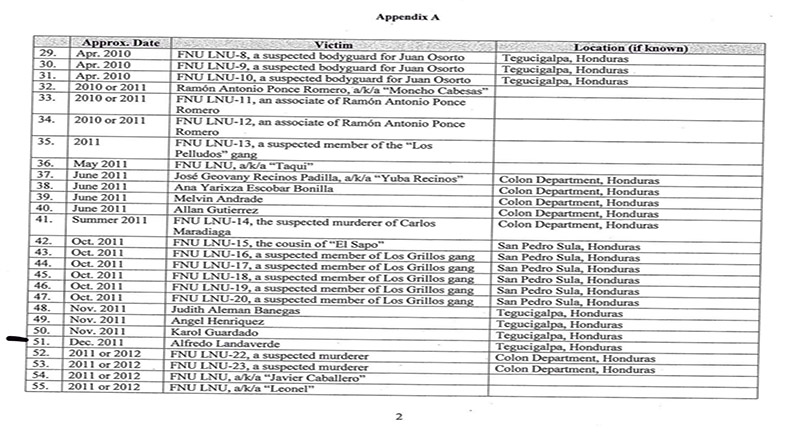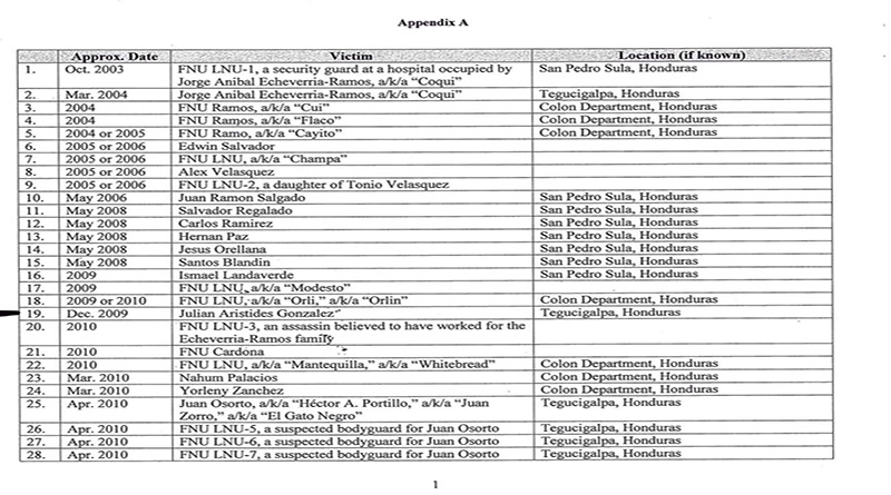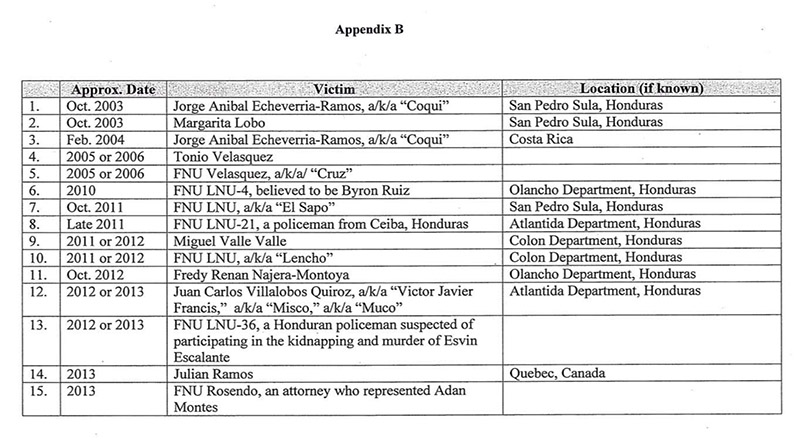 Hay un apéndice B donde aparece Coqui Echeverría Ramos quien era en un principio un hombre cercano a Los Cachiros y uno que se sospecha era Byron Ruiz, un narcotraficante buscado por la DEA en el departamento de Olancho y tambien aparecen los nombres de Miguel Valle Valle y el diputado olanchano, Fredy Nájera Montoya.