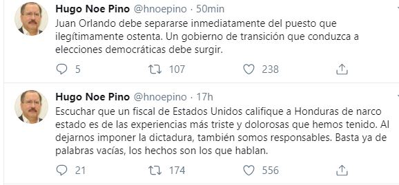 El expresidente del Banco Central de Honduras, Hugo Noé Pino escribió: Juan Orlando debe separarse inmediatamente del puesto que ilegítimamente ostenta. Un gobierno de transición que conduzca a elecciones democráticas debe surgir.