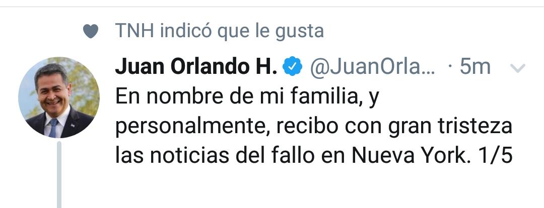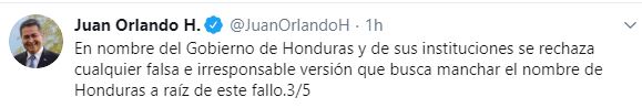 En otro post el mandatario dijo que, «En nombre del Gobierno de Honduras y de sus instituciones se rechaza cualquier falsa e irresponsable versión que busca manchar el nombre de Honduras a raíz de este fallo.