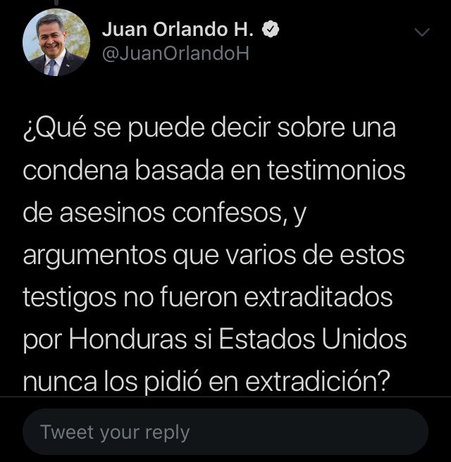 En otro tuit el presidente Juan Hernández señala que la condena a su hermano está basada en testimonios de asesinos confesos y argumentos que varios de estos testigos no fueron extraditados por Honduras si Estados Unidos nunca los pidió en extradición