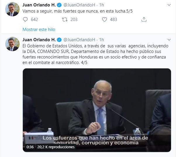 El mandatario ha estado muy productivo en su cuenta de Twitter y también ha escrito: El Gobierno de Estados Unidos, a través de sus varias agencias, incluyendo la DEA, COMANDO SUR, Departamento de Estado ha hecho público sus fuertes reconocimientos que Honduras es un socio efectivo y de confianza en el combate al narcotráfico.