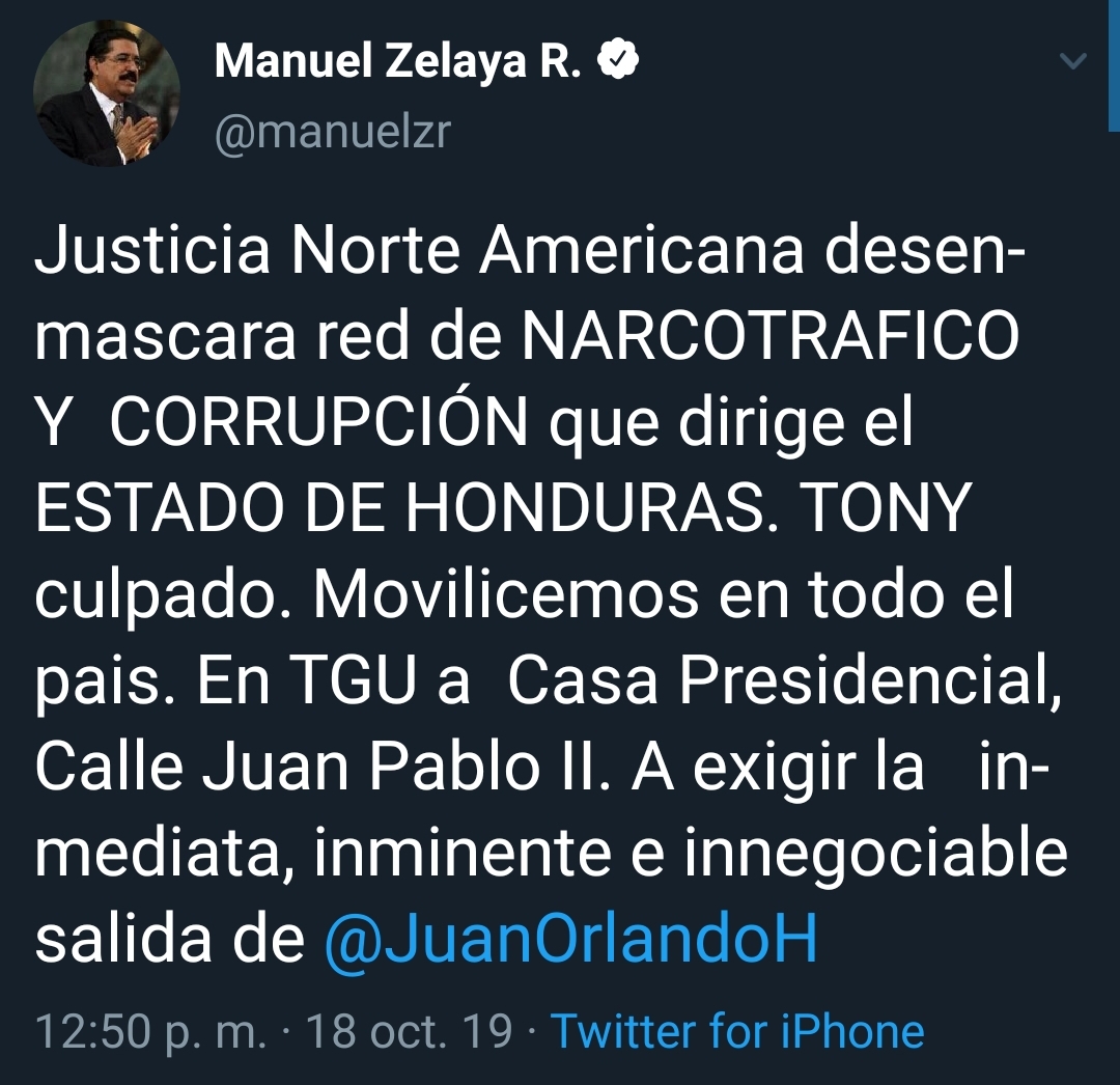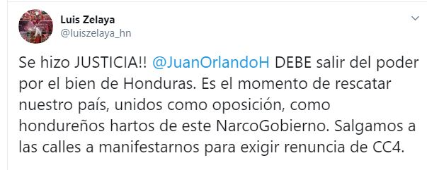 Por su parte el expresidente Manuel Zelaya ha manifestado en su cuenta de Twitter que la justicia norteamericana desenmascara red de narcotráfico y corrupción en Honduras y hace un llamado para que el pueblo se movilice en todo el país y vengan a Tegucigalpa a Casa Presidencial a exigir la inmediata, inminente e innegociable salida de Juan Hernández del poder.