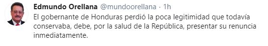 El primer fiscal general de Honduras, Edmundo Orellana escribió: El gobernante de Honduras perdió la poca legitimidad que todavía conservaba, debe, por la salud de la República, presentar su renuncia inmediatamente.