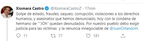 En otro tuit la virtual candidata del Partido Libertad y Refundación escribió: Golpe de Estado, fraudes, saqueo, corrupción, violaciones a los derechos humanos y asesinatos que hemos denunciado, hoy con la condena del hermano de JOH quedan desnudados. Por nuestro pueblo debo exigir justicia para las víctimas y la renuncia innegociable de Juan Hernández.