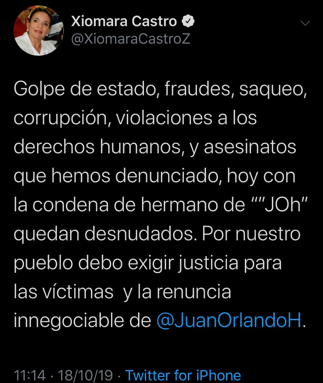 Por su parte Xiomara Castro de Zelaya escribió: Golpe de estado, fraudes, saqueo, corrupción, violaciones a los derechos humanos, y asesinatos que hemos denunciado, hoy con la condena de hermano de “”JOh” quedan desnudados. Por nuestro pueblo debo exigir justicia para las víctimas y la renuncia innegociable de @JuanOrlandoH