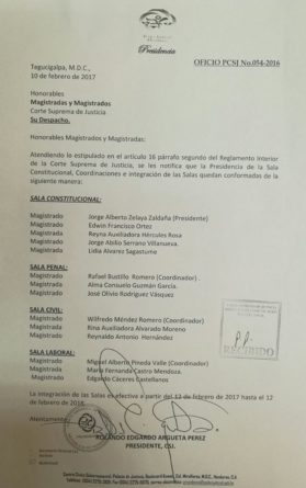 Tegucigalpa.-El Poder Judicial de Honduras emitió este viernes un oficio mediante el cual ha dado a conocer cómo quedarán integradas las diferentes salas a partir de este domingo 12 de febrero, en aplicación al artículo 16 del Reglamento Interno de la Corte Suprema de Justicia (CSJ).