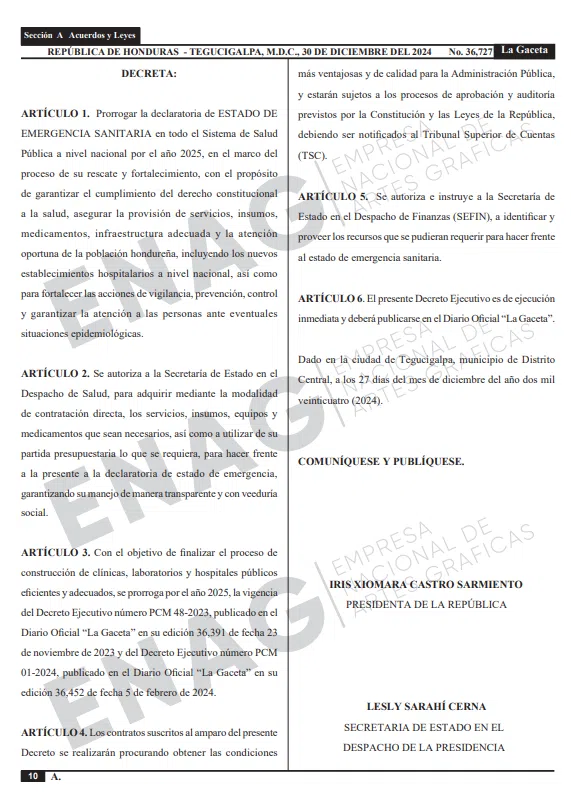 Ese mismo mes, el PCM 33-2024 intervino el Instituto Hondureño de Seguridad Social (IHSS) y autorizó a su Comisión Interventora a ejecutar compras directas de bienes, servicios, medicamentos, auditorías y consultorías, con el argumento de garantizar su funcionamiento.