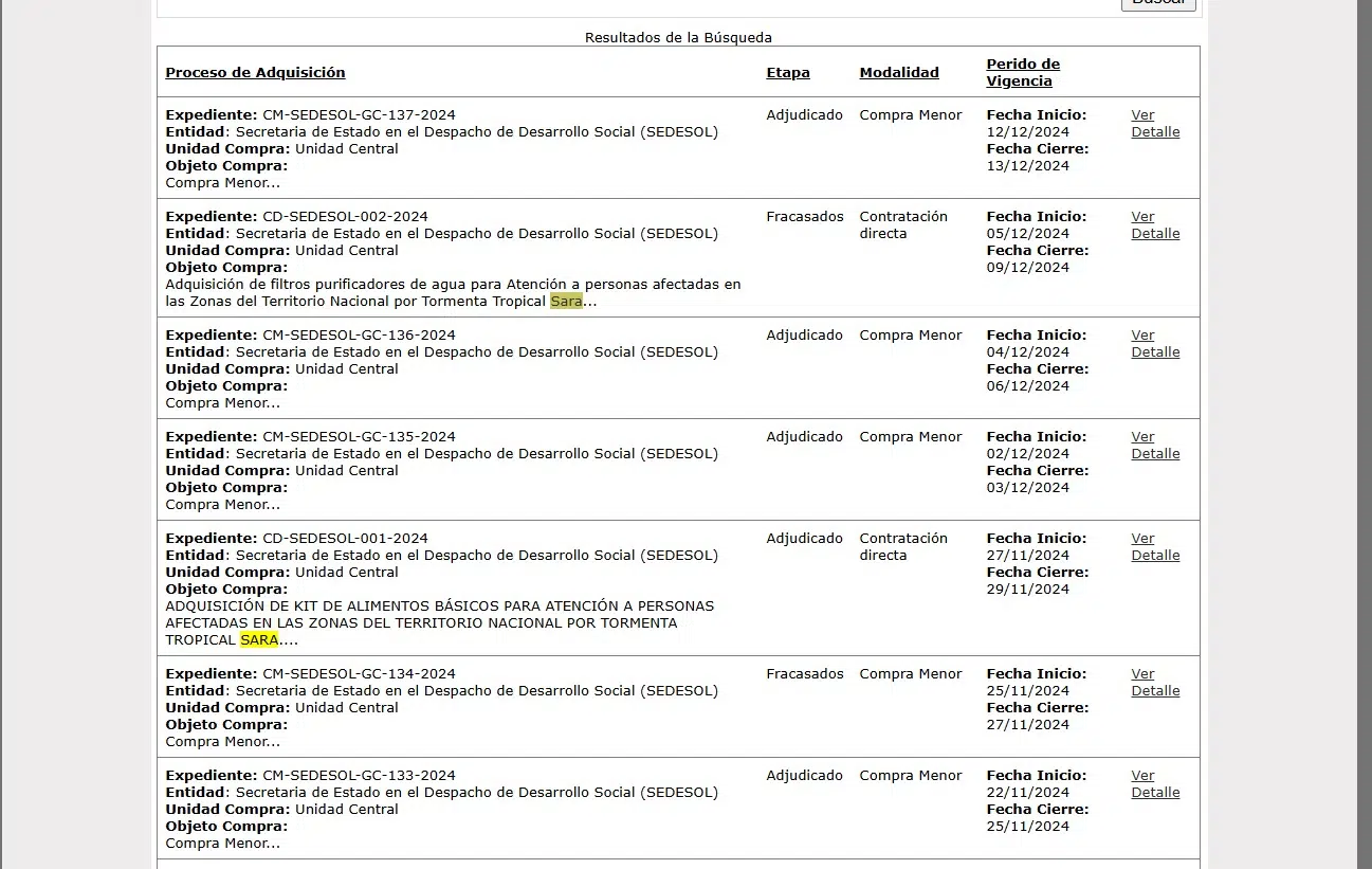 En esa búsqueda se encontró que la Secretaría de Desarrollo Social (Sedesol) publicó dos procesos de contratación directa, aunque solo uno fue adjudicado. La compra de filtros purificadores de agua fue declarada fracasada, mientras que la adquisición de kits de alimentos básicos sí fue adjudicada.