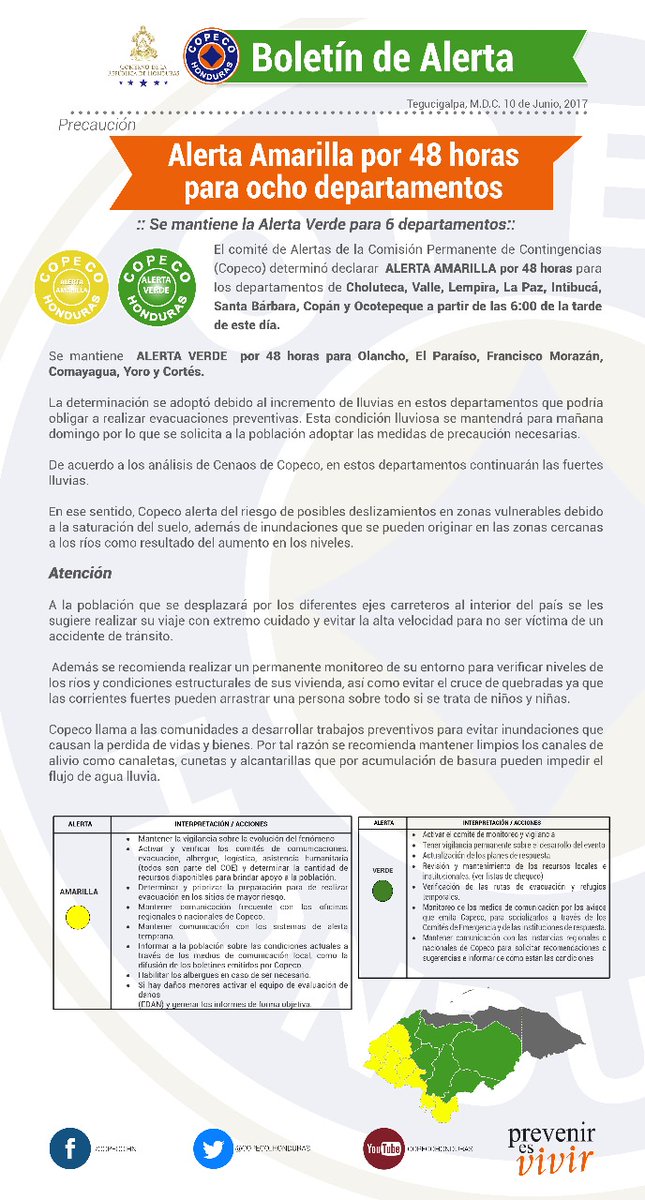 Tegucigalpa.- El incremento de las lluvias en 8 departamentos obligo a las autoridades de COPECO a decretar alerta amarilla para 8 departamentos que son: Choluteca, Valle, Lempira, La Paz, Intibucá, Santa Bárbara Copán y Ocotepeque.