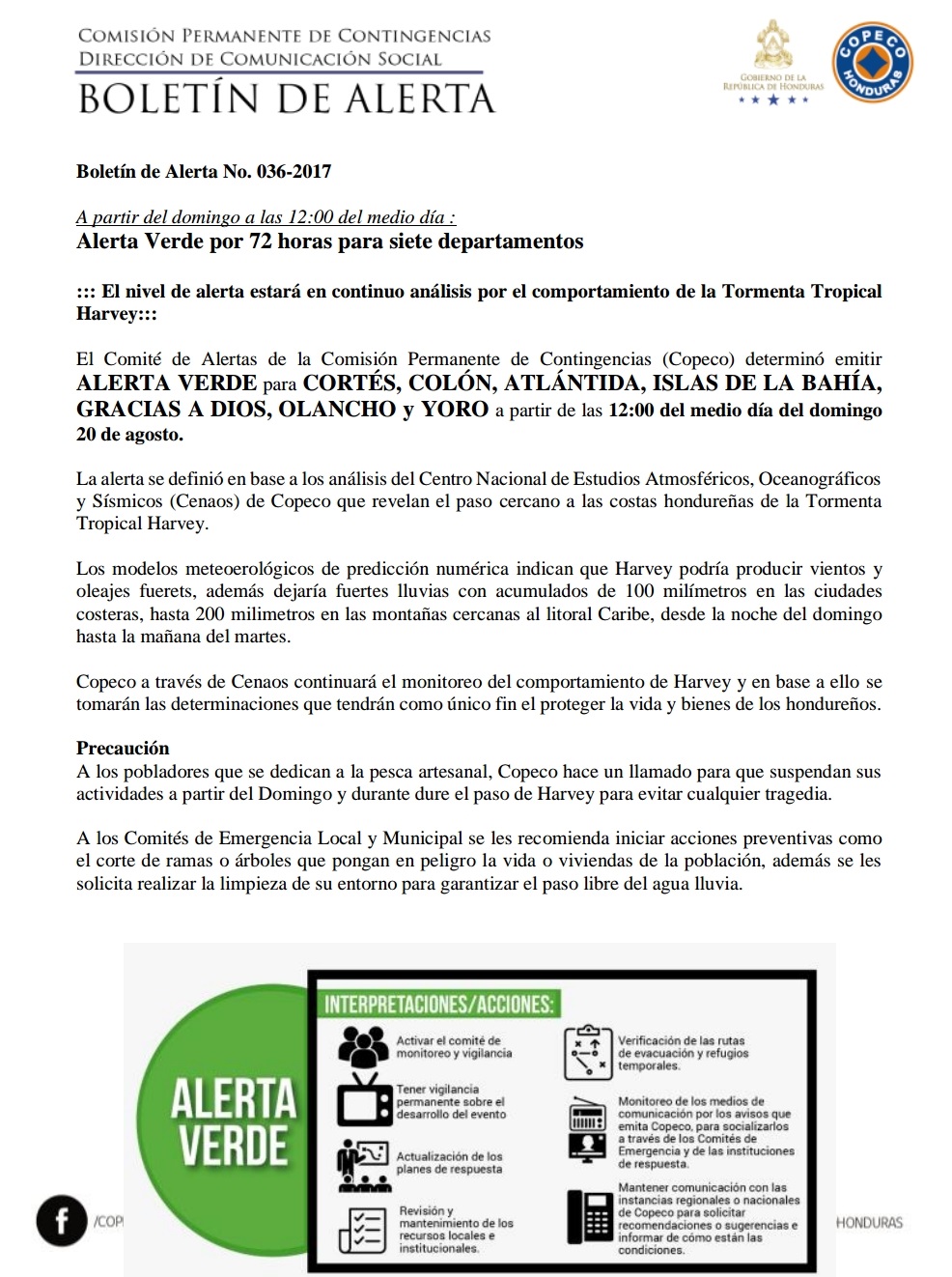 Tegucigalpa.- La Comisión Permanente de Contingencias (COPECO), emitió alerta verde para siete departamentos de Honduras ante la posible llegada de la tormenta tropical Harvey.