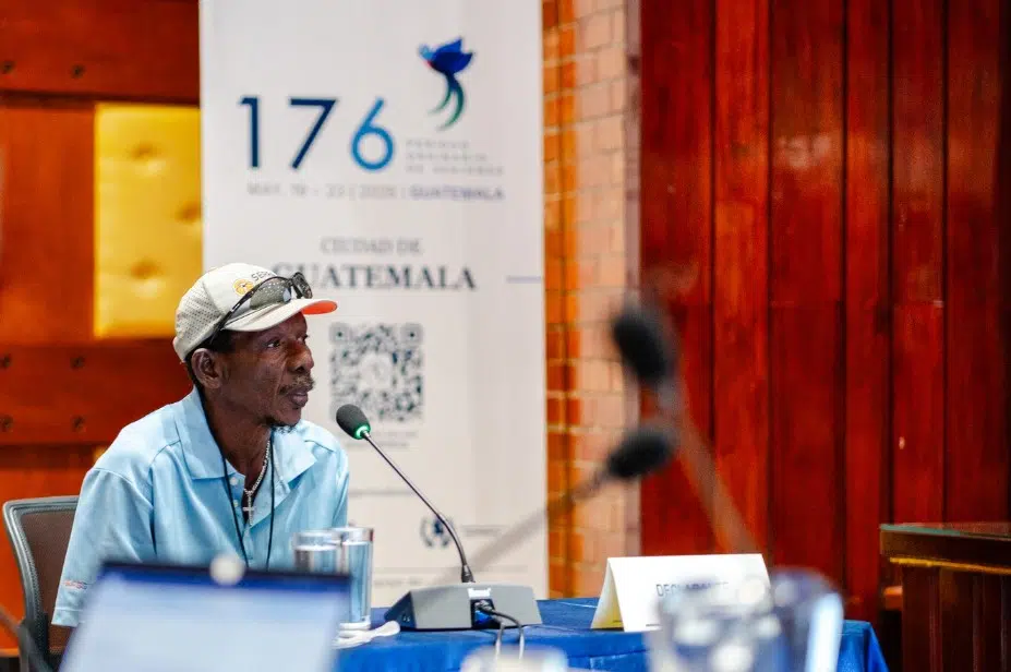 Rony Castillo en representación del pueblo garífuna y la Ofraneh se dirigió al tribunal Interamericano, afirmando que las restricciones no solo afectan a las comunidades que residen directamente en los cayos, sino también a las comunidades que están en territorio continental y que también dependen de la pesca para su subsistencia.