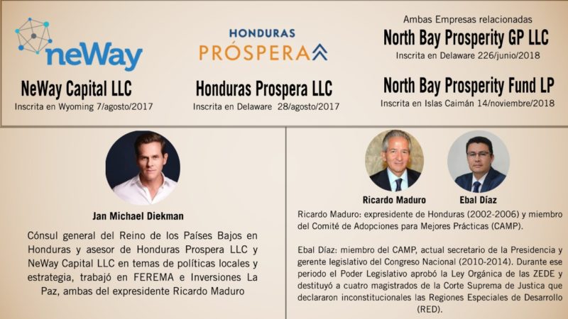 En el consejo asesor de Honduras Próspera y NeWay Capital en temas de Políticas Locales y Estrategia se menciona a Mike Dieckman, quien funge como cónsul general del Reino de los Países Bajos en Honduras. Dieckman, además, está ligado al expresidente Ricardo Ernesto Maduro Andreu (2002-2006) y mediante el decreto No. 368-2013 publicado en el diario oficial La Gaceta, fue uno de los 21 miembros nombrados (uno de cuatro hondureños) del Comité para la Adopción de Mejores Prácticas (CAMP) de las ZEDE. En el mismo decreto se nombró a Ebal Jair Díaz Lupian, actual secretario de la Presidencia.