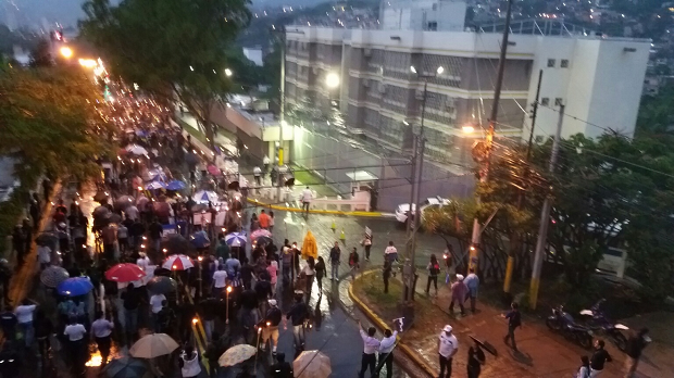 El reloj marcaba las 5:17 de la tarde de este viernes, cuando bajo una lluvia pertinaz, los pasos de los “indignados” comenzaron su recorrido en el bulevar Morazán, con rumbo a la embajada de los Estados Unidos, donde se pidió a esta representación diplomática, el respaldo para que las Naciones Unidas apoye la instalación de una Comisión Internacional Contra la Impunidad (CICI).