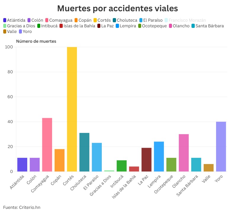 Según datos de la plataforma de la Policía Nacional, los departamentos con mayor número de muertes por accidentes viales son Cortés, con 100 fallecidos; Francisco Morazán, con 96; seguido de Comayagua y Yoro, con 43 y 40 respectivamente. En contraste, Gracias a Dios reporta la cifra más baja, con apenas un caso registrado.